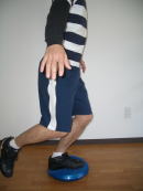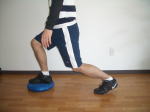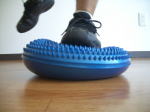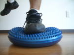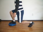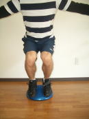 『中腰姿勢でバランス能力をUPさせる』 立った状態でいくらバランスが取れていてもスノーボードはうまくなりません。 雪面は見た以上に凸凹しているもの。 その凸凹に対応できる能力をつけましょう。 あえて不安定さを作って筋肉を刺激することで、より実践的なトレーニングができます。 使用するのは、バランスディスク(アジリティー・ディスク)。 最近はお手ごろ価格のものも出回っているので、一つ持っていると何かと便利なアイテムです。