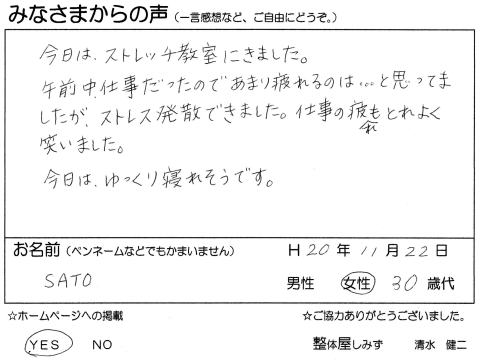 ストレッチは基本的に気持ちのよいもの。無理にぐいぐい伸ばさなければそれなりに効果も上がります。 最近は本を見てもスポーツクラブに行ってもストレッチについての説明があり、身体の表面を覆っている大きな筋肉を伸ばす効果のあるストレッチは一般的に知られるようになりました。 ということで、ここ(ストレッチ教室)で扱うストレッチは一味違うものをご紹介します。 何が違うか。 それは、伸ばす(ほぐす)筋肉が違います。 伸ばし方が違います。終わったあとのすっきり感が違います。 などなど。 今までやっていたストレッチとの違いを感じていただける内容になっています。 具体的には、床に寝転んだ状態で、身体をグニャグニャ動かします。 がんばりません。できるだけ力を抜いて行います。これが意外と難しいんですが・・・。 力を入れると筋肉が緊張してしまい、うまくほぐせなくなってしまうのです。 最初はチョット難しいですが、こつさえつかんでしまえば楽々。全身の筋肉が緩み、血液とリンパの流れが抜群によくなります。身体がグニャグニャニなって心までゆったりとした気分になれます。 東京や名古屋では、バレエダンサー、コンテンポラリーやジャズダンスをされてみえるダンサーの方にも人気にあるストレッチです。 そんなストレッチを体験していただきたいということで、ストレッチ教室を開催しております。 もちろん運動経験のない方でも大丈夫です!どなたにでもご参加いただける安心・安全なコアストレッチ。 興味をもたれた方は、お電話または、メールにてお問い合わせください。
